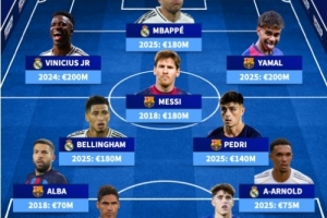 体育资讯10月24日讯 本周末,西甲将上演万众瞩目的西班牙国家德比。德国转会市场盘点了皇马和巴萨球员历史身价最高阵,梅西、C罗、姆巴佩、亚马尔等悉数在列。