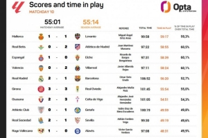 OPTA数据统计显示,本场国家德比总时长106分钟52秒,是本轮西甲比赛最长。但净比赛时间仅56分20秒,位列本轮西甲比赛第5,净比赛时长占比仅52.7%。