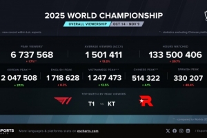 体育资讯11月10日讯 昨日T1和KT的总决赛观众峰值达到了673w,而T1对阵BLG是694w。
