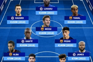 前锋:埃登·阿扎尔(切尔西,1.5亿,2018年)、罗梅卢·卢卡库(切尔西,1亿,2021年)、拉明·亚马尔(巴塞罗那,2亿,2025年)