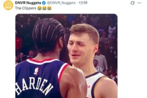 掘金自媒体晒出上赛季季后赛布劳恩盯着哈登冷笑的图,并写道:“快船😂😂😂”