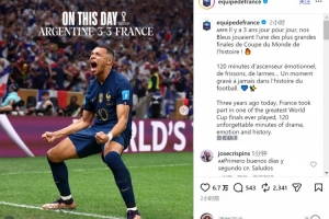 法国队官方社媒晒出姆巴佩庆祝进球的照片,配文:“3年前的今天,法国队参加了史上最精彩的世界杯决赛之一。那是120分钟令人难忘的戏剧性、情感与历史时刻的交织。”