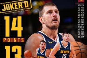 掘金官方晒出了约基奇本场比赛的数据海报,并写道:“赛季至今,一半的比赛都拿到了三双。”