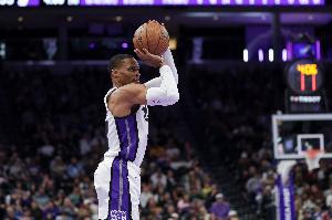 威少目前生涯总得分26638分,再得73分,他将超越大O(26710分),成为控卫历史得分王。