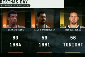 本场,约基奇出战43分钟,投篮21中15,三分6中4,罚球23中22,砍下56分16篮板15助攻2盖帽,正负值+15!