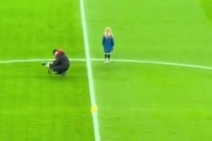 视频显示,纽卡斯尔的球员们跑开去脱掉训练服并热身时,这位小球童独自站在球队后方。随后她独自徘徊到中线附近,看上去很不自在,不知所措地环顾场地,双手插在口袋里站着。