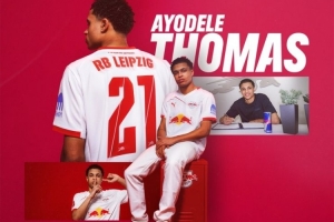 公告写道:“RB莱比锡签下攻击手阿约德勒·托马斯,这位18岁的球员从埃因霍温转会而来,与RB莱比锡签约至2031年,他将身披21号球衣。”