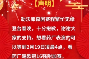 勒沃库森因赛程繁忙无缘登台春晚,十分抱歉,谢谢大家的支持。想看药厂表演的可以等到2月19日凌晨4点,看药厂踢欧冠16强附加赛。
