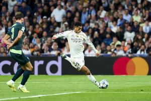 比赛一开始便带来了惊喜,不过不是在场上,而是在看台上。“嘿,祖德”,迪斯蒂法诺球场传来了这样的声音,是一群孩子在吸引贝林厄姆的注意,他和母亲丹妮丝一起出现在了看台上。开场时英格兰人是焦点,但很快注意力就转移到了球场上。