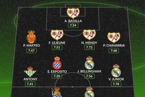 WhoScored西甲10月最佳阵:姆巴佩、安东尼、贝林、维尼修斯在列
