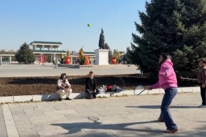 前美网冠军拉杜卡努回沈阳探亲,在公园与大妈打起网球