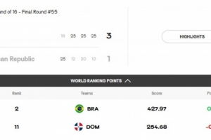 体育资讯8月31日讯 2025年世界女排锦标赛下半区1/8决赛,巴西女排3-1(18-25 25-12 25-20 25-12)逆转战胜多米尼加女排,巴西女排晋级八强,1/4决赛将对阵法国女排,多米尼加女排止步16强。
