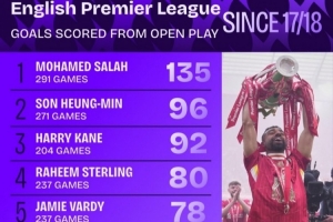 体育资讯9月7日讯 squakwa统计了17-18赛季以来的英超运动战进球情况,萨拉赫135球断崖领跑。
