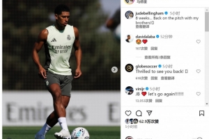 贝林厄姆社媒晒出训练照片,配文:“(缺席)8周,终于回到球场与我的兄弟们在一起。”