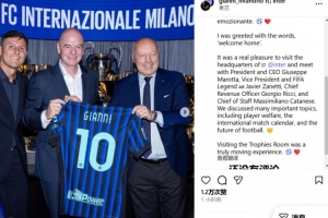 因凡蒂诺写道:我这次的经历可以用“回家”来形容。非常荣幸能访问国米总部,并与俱乐部CEO马洛塔、副主席兼国际足坛传奇萨内蒂、首席营收官乔治-里奇以及首席参谋马克西米里亚诺-卡塔内塞会面。我们讨论了许多重要议题,包括球员福祉、国际比赛日赛程以及足球的未来等等。参观俱乐部荣誉室是一次深受触动的经历!