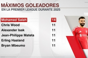 这是萨拉赫在2025年英超打进的第14球,领跑所有球员,并列次席的伍德、伊萨克、马特塔、哈兰德以及姆伯莫均是打进11球。