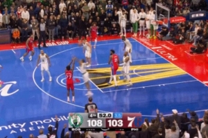 埃奇库姆和恩比德二人转 接他传球三分再中76人8-0分差缩小至2分