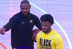 只见詹姆斯从场边走向正在练习投篮的布朗尼,并指向场边:“布朗尼,你妈说她要叫你过去!”布朗尼则立即停止训练,扫视场下妈妈的位置。