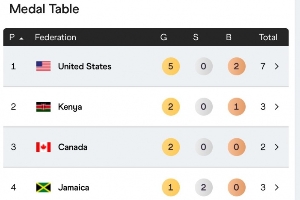 2、肯尼亚,2金0银1铜,3块奖牌