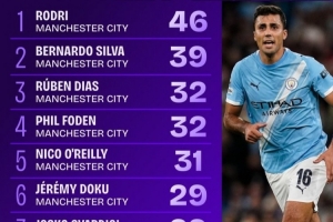 体育资讯9月19日讯 著名数据网站Squawka统计了欧冠首轮进攻三区传球数据,罗德里46次居首,曼城球员包揽前十。