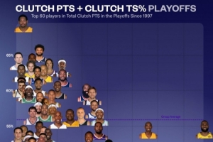 体育资讯9月29日讯 近日,数据媒体NBA University总结了自从1997年以来(NBA官网该项数据统计起始时间)在NBA季后赛中关键得分前60球员的真实命中率分布图表。
