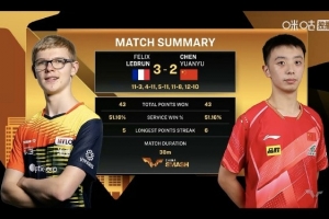 体育资讯10月1日讯 WTT中国大满贯男单1/16决赛,陈垣宇2比3不敌菲利克斯-勒布伦无缘16强,菲利克斯-勒布伦下一轮对阵约内斯库。
