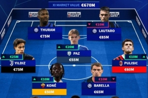 中场:伊尔迪兹(尤文图斯,7500万欧元)、帕斯(科莫,5500万欧元)、普利西奇(AC米兰,6000万欧元)、科内(罗马,5000万欧元)、巴雷拉(国际米兰,6500万欧元)