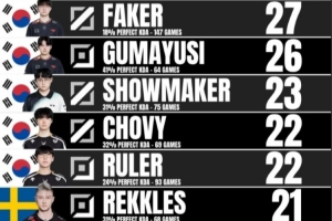 1.Faker:147场/27场完美KDA 18%0死率