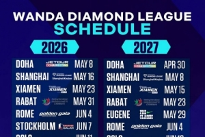 2027年钻石联赛的安排也已经出炉,同样是15站,第一站多哈(4月30日)、上海是第二站(2027年5月8日),厦门是第三站(2027年5月17日)、然后依次是摩洛哥拉巴特站(5月23日)、美国尤金站(5月29日)、意大利罗马站(6月4日)、挪威奥斯陆站(6月10日)、瑞典斯德哥尔摩站(6月13日)、法国巴黎站(6月18日)、摩纳哥站(7月9日)、英国伦敦站(7月17日)、波兰西里西亚站(7月25日)、瑞士洛桑站(8月18日)、比利时布鲁塞尔站(8月20日)、总决赛瑞士苏黎世站(8月26、27日)。