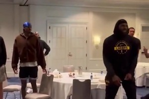 恩比德从后方主动拉住哈登示好:我知道你生气 但我还是要打招呼